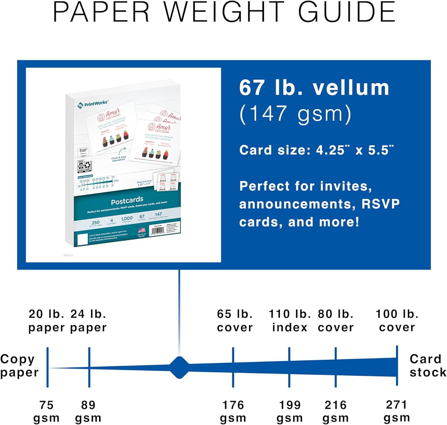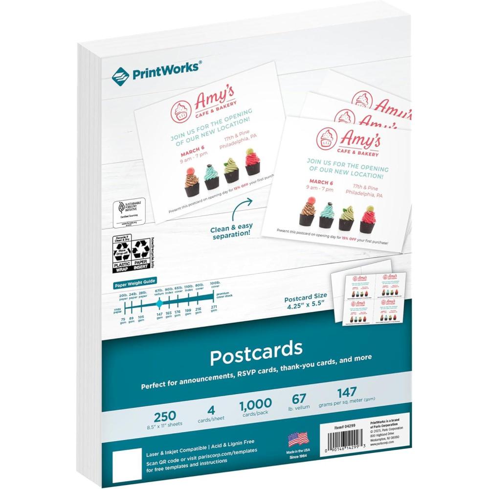 PrintWorks Blank Printable Postcards for Mailing & Printing – 1000 Cards (4.25″ x 5.5″ Post Card Size) – 4 per Sheet – 250 Sheets (8.5” x 11”) – Made in the USA – No Envelope Needed – White (04299)(4.25 x 5.5 Inches)